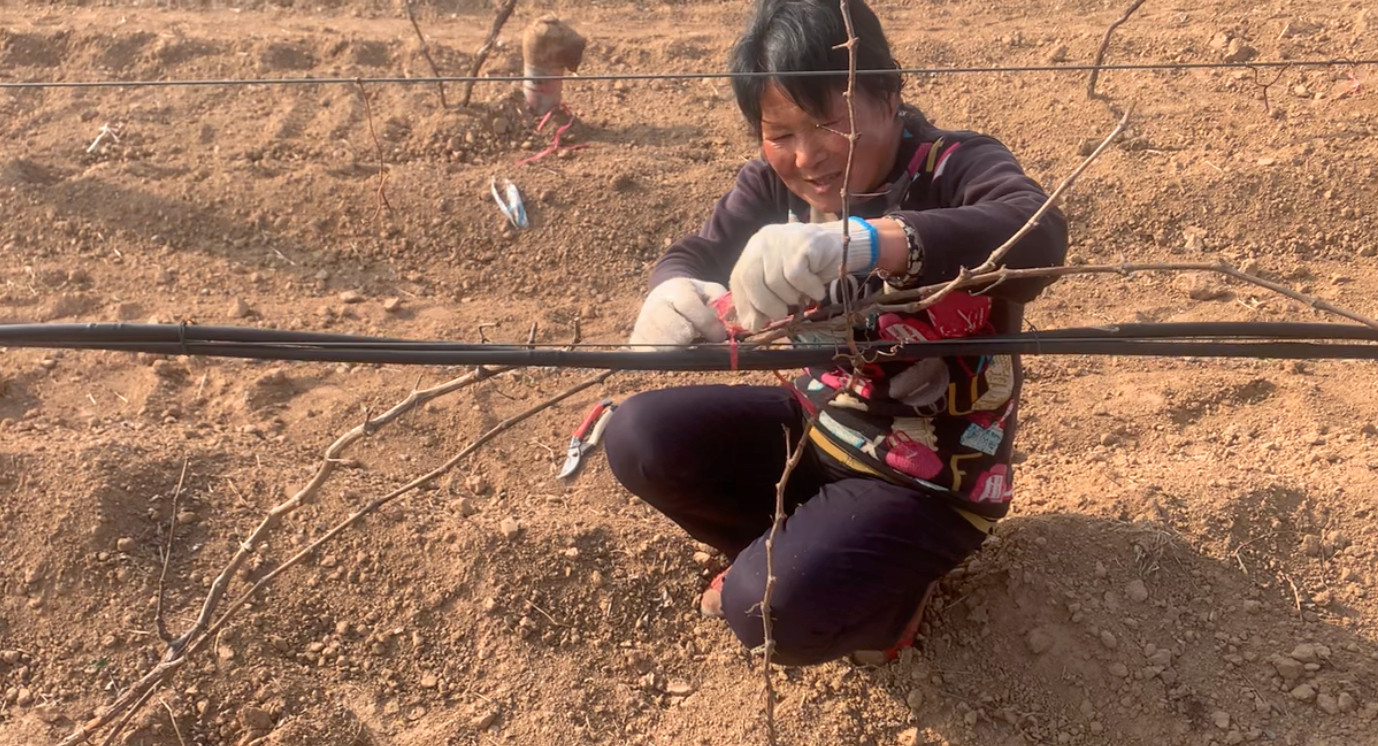 春分是破土而出的希望,也是農忙的好時節,此時的格瑞特葡萄種植基地正在進行渠灌澆水、小苗綁繩上架、樹下干草清理等工作。葡藤出土后,要及時上架綁枝,枝條要均勻擺布到架面上,合理利用空間,不能交叉或重疊,同時綁枝時必須牢固,這樣既可以使葡萄受光均勻,也可以防止受到風災影響而掉下來影響葡萄生長,綁繩上架的葡藤讓格瑞特葡園更加規范化、標準化。